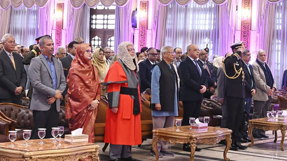 শপথ গ্রহণ অনুষ্ঠানে উপস্থিত ছিলেন অন্তর্বর্তী সরকারের প্রধান উপদেষ্টা নোবেলজয়ী অধ্যাপক ড. মুহাম্মদ ইউনূস।