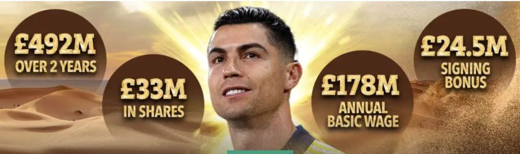 দ্যা সানের হিসেবে ঘণ্টায় রোনালদোর বেতন ৩৪ লাখ ২৫ হাজার টাকা। আর মিনিটে ৫৭ হাজার ৩৬ টাকা। শুধু তাই নয় সাইনিং বোনাস হিসেবে রোনালদো পাচ্ছেন ২৪.৫ মিলিয়ন পাউন্ড।