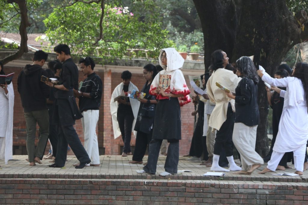 একাত্তরের মহান মুক্তিযুদ্ধ ও জুলাই অভ্যুত্থানে শহীদ ও আহতদের শ্রদ্ধা জানাতে চারুকলায় শুরু হয়েছে দুইদিন ব্যাপী পারফর্মেন্স আর্ট- ‘শোন মহাজন আমরা হাজারজন’।