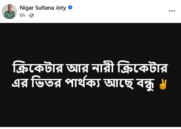 নারী জাতীয় দলের অধিনায়ক নিগার সুলতানাও ক্ষুব্ধ এ নিয়ে। তিনি নিজের ফেইসবুক পোস্টে লিখেছেন, ‘‘ক্রিকেটার আর নারী ক্রিকেটারের ভেতর পার্থক্য আছে বন্ধু।’’ এই পোস্টে মন্তব্য করেছেন ৭৫০ জনের বেশি। প্রায় সবাই সহমত জানিয়েছেন নিগারের প্রতি।