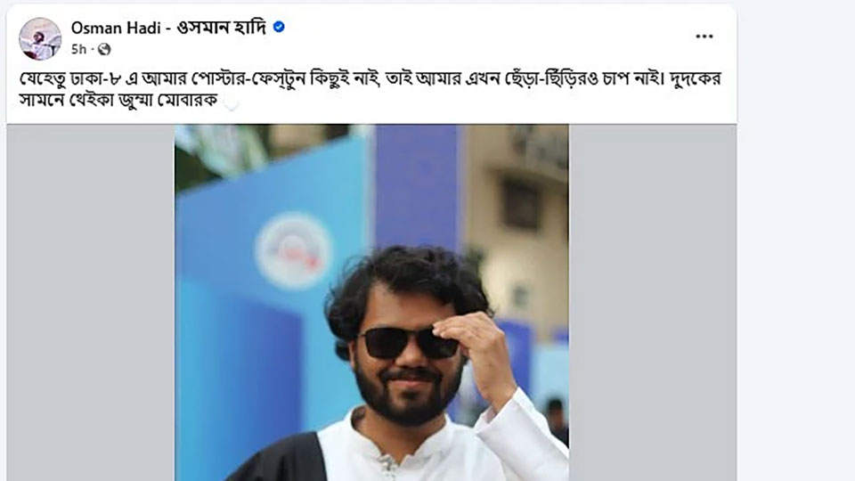 জুমার নামাজের আগে বেলা ১১টা ৫২ মিনিটে হাদি ফেইসবুকে লেখেন, “যেহেতু ঢাকা-৮ এ আমার পোস্টার-ফেস্টুন কিছুই নাই, তাই আমার এখন ছেঁড়া-ছিঁড়িরও চাপ নাই। দুদকের সামনে থেইকা জুম্মা মোবারক।”