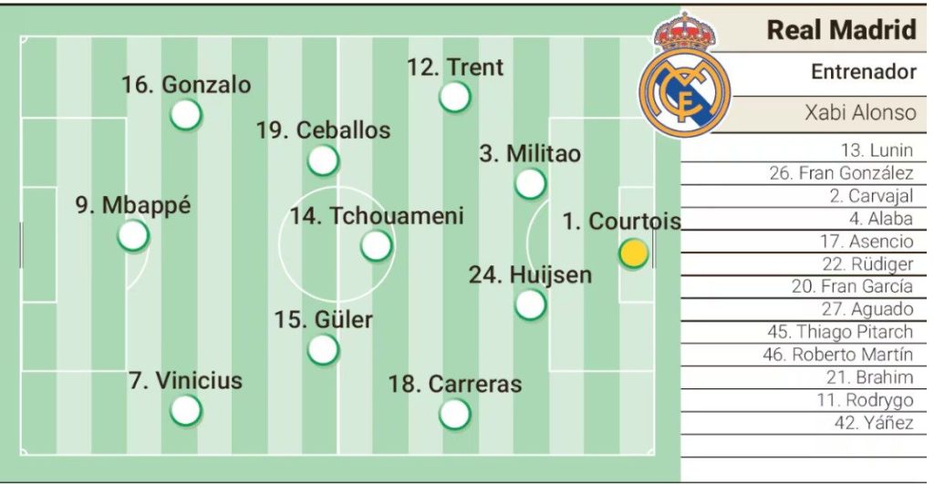 চোটের জন্য এই ম্যাচে নেই বেলিংহাম, মেন্দি, কামাভিঙ্গা, ভালভের্দে ও এনদ্রিক। ৪-৩-৩ ছকে রিয়ালের চার ডিফেন্ডার হতে পারেন আরনল্ড, মিলিতাও, হাউসেন ও ক্যারারেস। মাঝমাঠে কাবায়োস, চুয়ামেনি ও গুলের। আর আক্রমণভাগে এমবাপ্পে, ভিনিসিয়ুস ও গার্সিয়া।