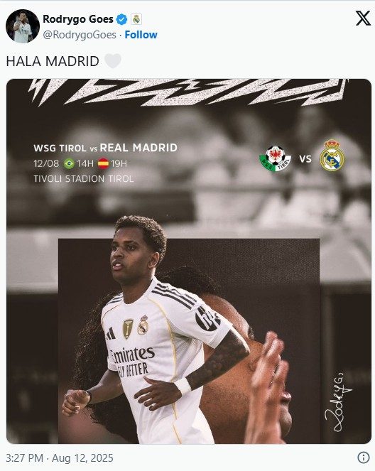 এমন গুঞ্জনের মাঝে রোদ্রিগো সামাজিক যোগাযোগ মাধ্যমে লিখেছেন, ‘‘হালা মাদ্রিদ।’’ অর্থাৎ রিয়ালেই থাকতে চান এই ব্রাজিলিয়ান।