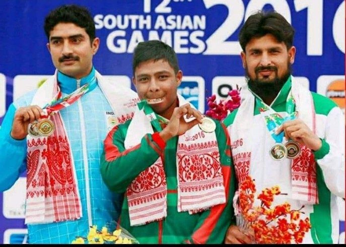 ভারত ও পাকিস্তানের শুটারের সঙ্গে সোনাজয়ী শাকিল আহমেদ। ছবি: সংগৃহীত