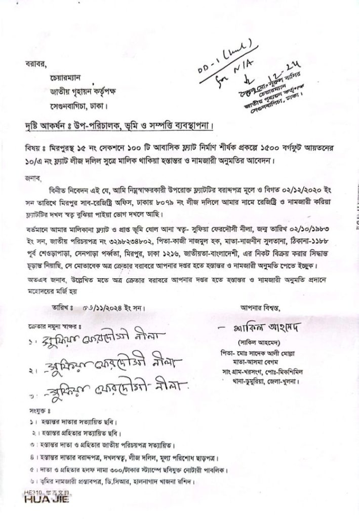 ফ্ল্যাটটি বিক্রির অনুমোদনের জন্য ২০২৪ সালের ডিসেম্বরে শাকিল জাতীয় গৃহায়ন কর্তৃপক্ষের চেয়ারম্যান বরাবর একটি চিঠি দিয়েছেন। কিন্তু এখনও কর্তৃপক্ষ এখনও কোনও সিদ্ধান্ত জানায়নি। ওই চিঠিতে ক্রেতার নাম উল্লেখ করা হয়েছে জনৈক সুফিয়া ফেরদৌসী নীলা এবং তার নমুনা স্বাক্ষরও আছে ওই আবেদন পত্রে। এ প্রসঙ্গে জাতীয় গৃহায়ন কর্তৃপক্ষের ভারপ্রাপ্ত চেয়ারম্যান ফেরদৌসী বেগমের মুঠোফোনে যোগাযোগ করা হলেও মোবাইল ফোন বন্ধ পাওয়া গেছে।