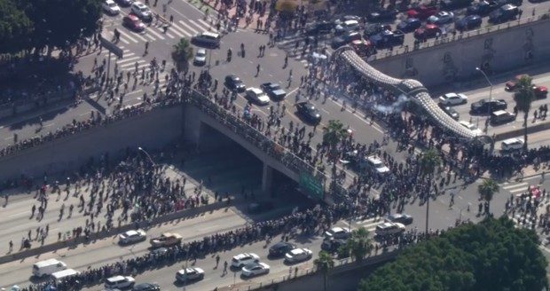 সিবিএস লস অ্যাঞ্জেলেসের ভিডিওতে দেখা যায়, কিছু বিক্ষোভকারী ইউএস মার্শাল সার্ভিসের একটি বাসের পথ আটকে দেওয়ার চেষ্টা করেন। আবার কেউ কেউ আইনশৃঙ্খলা বাহিনীর গাড়ির দিকে পাথর ও অন্যান্য বস্তু নিক্ষেপ করেন।